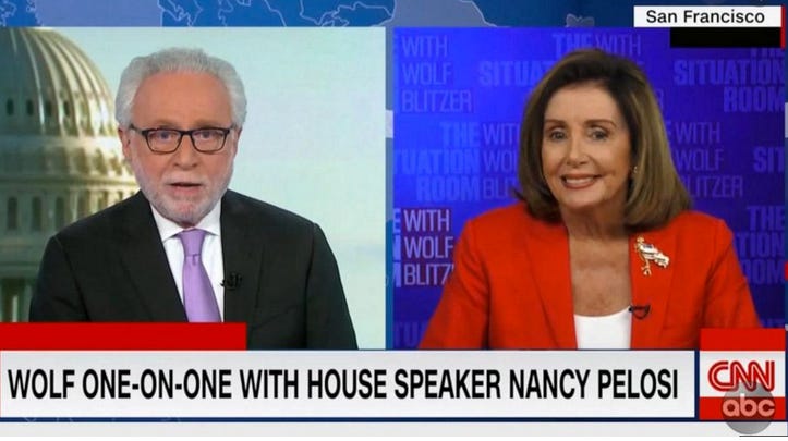 • Wolf Blitzer launched into a heated argument with Speaker of the House Nancy Pelosi last October, demanding to know why she wouldn't accept a White House Covid relief proposal, even though Senate Republicans didn't support it, which meant the White House proposal was never going to be voted on. Not once this year did I see Blitzer angrily confront a member of the GOP regarding Covid relief, which the party opposed for ten months.