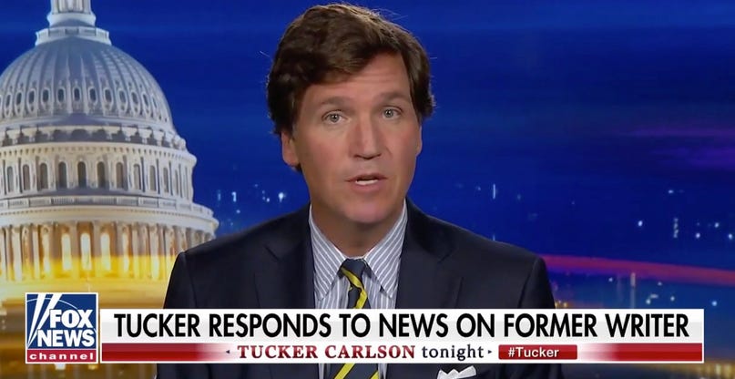 Announcing a "long-planned" vacation that weirdly started on a Tuesday, Fox News' Tucker Carlson recently faced another controversy that threatened his already-dwindling lineup of willing sponsors. After CNN discovered that Carlson's head writer had spent years pseudonymously posting wildly vulgar, KKK-like rants online, Carlson announced on a Monday night that he was off on a "trout fishing" trip. Sudden vacations have become a Fox News staple for hosts who come under fire and sponsors start to flee — it's a way to try to lower the temperature on the spreading controversy.