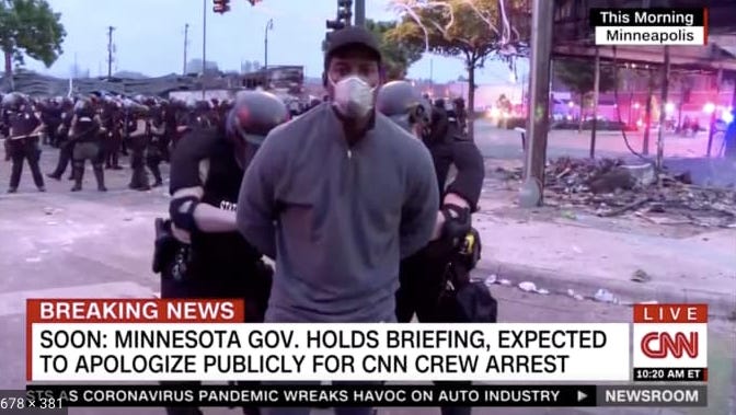 *Minneapolis: Police opened fire with rubber bullets on a local CBS News crew, while the ABC News crew was tear gassed and pepper sprayed. So were reporters from the Los Angeles Times. Simon Moya-Smith was pepper sprayed and arrested after identifying herself as a journalist many times. Photojournalist Linda Tirano was permanently blinded in her eye after being hit in the face with a rubber bullet fired by police. Earlier, CNN reporter Omar Jimenez was handcuffed and detained live on the air.