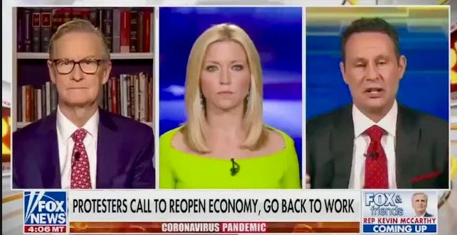But there's a big difference this time around — Fox News hosts aren't showing up at the "reopen America" rallies where defiant protesters disregard social distancing guidelines and refuse to wear protective masks, thereby possibly spreading the illness. Well-paid Fox News hosts don't want to personally appear at the protests the way they constantly showed up at Tea Party rallies — Tea Party rallies that didn’t pose the threat of a highly contagious virus in the air.