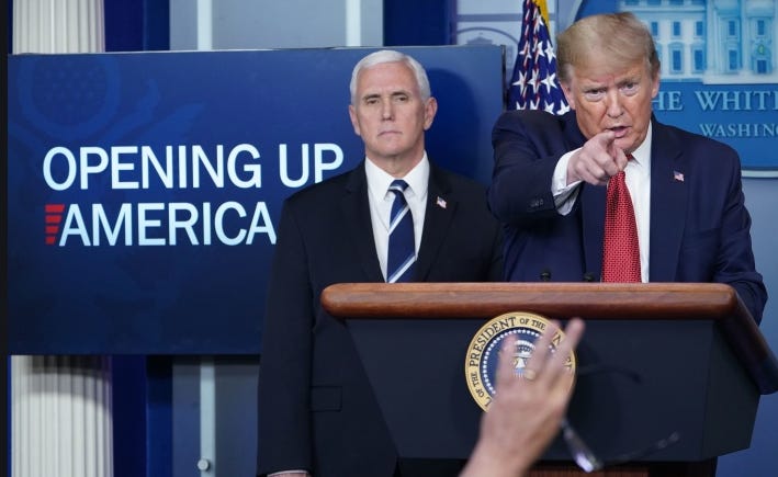 It's not as if Trump has simply been misguided and made wrong decisions along way. It's that Trump purposefully refused to use the vast powers of the federal government to protect the country from the virus crisis, and has urged Republican governors to rush ahead with deadly re-open plans. His actions have killed untold numbers of Americans.